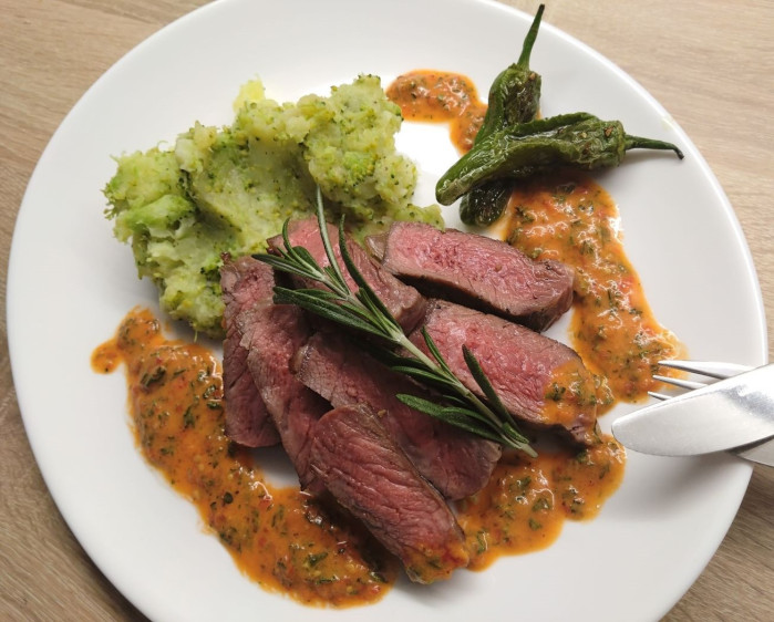 Beim Roastbeef Steak auf der Fettseite mehrfach einschneiden. Das Steak mit Salz, Pfeffer und eine Prise Zucker auf der einen Seite würzen und dann von dieser Seite in einer heißen Pfanne mit einem Zweig aus Rosmarin und 2 zerdrückten Knoblauchzehen braten. In der Pfanne die andere Seite würzen. Wenn das Roastbeef von beiden Seiten gut gebräunt ist in Alufolie verpacken und für 10 Minuten bei 95° im Ofen weitergaren. Zum Schluss den Teller anrichten. Dazu das Fleisch dünn in Scheiben aufschneiden und fächerartig an den Stampf legen. Die Vinaigrette angeben und den Teller mit Kräutern garnieren.