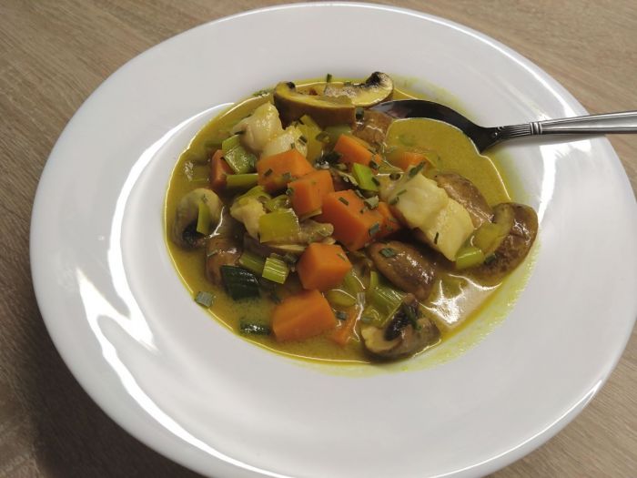 In einen Topf oder Wok Öl geben, gerne Walnussöl oder Kokosöl. Nun die Würfel vom den Frühlingszwiebel, Knoblauch, restliche Peperoni und den geraspelten Ingwer darin anschwitzen. Danach die Currypaste hinzugeben und ein paar Minuten unter Rühren weiter braten. Das ganz dann mit einem Schuss Fischfond ablöschen. Nun kommen die Paprikawürfel und die gewürfelten Süßkartoffeln dazu, alles zusammen weitere 2 Minuten anbraten und danach mit der Kokosmilch auffüllen. Nun das Ganze köcheln lassen, bis die Süßkartoffeln weich sind. Jetzt die Champignons in Scheiben dazugeben und alles mit Salz, Pfeffer und der Sojasauce abschmecken. Zum Schluss die Fischstücke hinzugeben, den Topf vom Herd nehmen und mit geschlossenem Deckel noch 5 Minuten ziehen lassen. Das Curry in tiefe Teller füllen und sich schmecken lassen. Wer mag nutz als Beilage noch eine wenig Reis.