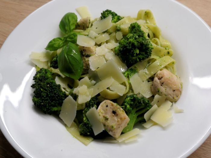 Den Brokkoli mit Salzwasser für 2 - 4 Minuten blanchieren, danach abschütten und im Eiswasser abschrecken. Zum Trocknen in einem Sieb geben. Nudelwasser mit Salz aufsetzen und die Nudeln nach Packungsanleitung al dente kochen. In der Zwischenzeit die Hühnerbrust in mundgerechte Stücke schneiden und in einer vorbereiteten Pfanne mit Öl und den Schalotten sowie ein wenig fein geschnittener Peperoni anbraten. Hat das Huhn ausreichend Farbe angenommen den Brokkoli hinzufügen und alles mit ein wenig Hühnerfond ablöschen. Zum Schluss die Pasta aus dem Kochwasser gleich in die Pfanne geben. Alles mit dem Pesto vermischen gut unterrühren und auf einem Teller anrichten. Auf dem Teller ein wenig geriebenen Parmesan rübergeben. Guten Appetit!