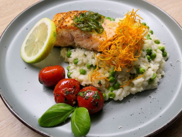 Die Charlotten und eine Knoblauchzhe schälen und in feine Würfel schneiden. Beides in einem mit Olivenöl vorbereiteten warmen Topf geben und anschwitzen. Wenn die Würfel Farbe angenommen haben, den Risottoreis zugeben und mit mehrmaligen rühren ebenfalls anschwitzen. Nach ca. 3 Minuten den vorgewärmten Gemüse Fond immer in kleinen Mengen dazugeben. Sodass der Reis die Flüssigkeit aufnehmen kann. Mit etwas Salz und Pfeffer würzen, sowie die Chiliflocken dazugeben. Ohne Deckel bei mittlerer Hitze unter weiterem rühren garen für ca. 20 Minuten. Dabei nach und nach mit restlichem Fond auffüllen. Sobald der Fond vom Reis fast komplett aufgesogen ist, Erbsen dazugeben und ca. 5 Min. ziehen lassen. Nun Zitronensaft nach Geschmack hinzugeben, ebenfalls 3/4 des geriebenen Käses mitsamt Butter unter das Risotto rühren. Währenddessen den Lachs in eine mit Öl, einen Rosmarin- und Thymianzweig und einer Knoblauchzehe aromatisierten Pfanne geben und von der Hautseite braten. In der Pfanne den Fisch mit Salz und Pfeffer würzen. Einige Blätter Petersilie und Thymian hacken und beiseitestellen. Wenn der Fisch ausreichend Wärme von der Seite gezogen hat, wenden und die andere Seite kurz braten.