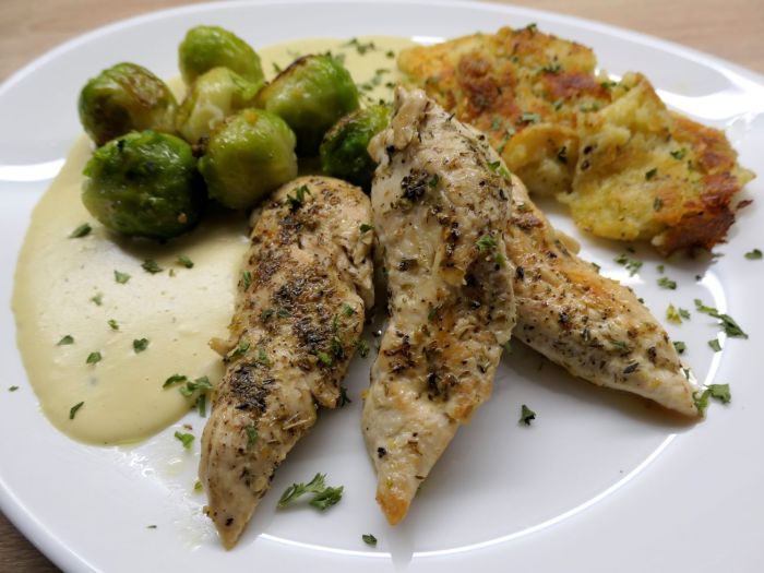 Den geputzten Rosenkohl in Salzwasser bissfest garkochen. Durch ein Sieb abschütten und zur Seite stellen. Die Hähnchenbrust Stücke waschen und trocken tupfen. Von beiden Seiten mit Salz, etwas Pfeffer und den Kräutern würzen. In einer Pfanne mit wenig Öl von beiden Seiten goldbraun braten. Kurz vor Ende der Garzeit die Rosenkohlstücke mit in die Pfanne geben.