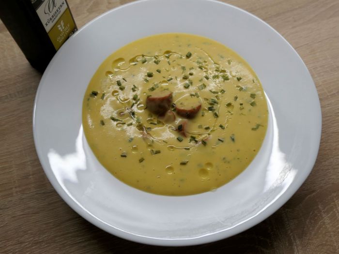 Den Gemüsefond in den Topf geben und alles bei mittlerer Hitze für 10 Minuten köcheln lassen, bis das Gemüse weich ist. Den Topf vom Herd nehmen und das Gemüse mit einem Pürierstab unter Zugabe der Sahne cremig pürieren. Die Wurst in Stücke hinzugeben, sowie 1 TL Essig und 1 TL Zucker. Das Ganze noch mal abschmecken und für gute 10 Minuten aus kleiner Flamme auf dem Herd ziehen lassen, bis die Wurst warm ist. Auf den Tellern servieren, einige Spritzer Olivenöl zugeben sowie mit gehackter Petersilie dekorieren.