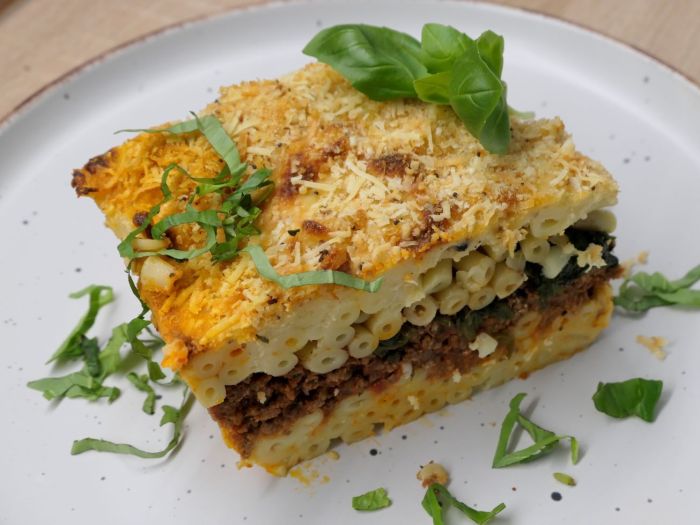 Die Makkaroni in einem Topf mit gut gesalzenem Wasser kochen. Auf jeden Fall sollten die Nudeln noch biss haben. Nudeln durch ein Sieb abgießen. Die Auflaufform einfetten und den Backofen vorheizen (180° C Ober- / Unterhitze). Angefangen mit den Nudeln schichtweise Nudeln, Fleischsoße, Béchamelsoße gleichmäßig in der Auflaufform verteilen. Die Schicht Spinat sollte sich in der Mitte befinden und die letzte Schicht mit Béchamelsoße abschließen. Mit jeweils 50 g Käse und Brösel bestreuen und für 30 Minute im Ofen backen, bis die Oberfläche goldbraun ist. Danach noch gut 10 Minuten abkühlen lassen.
