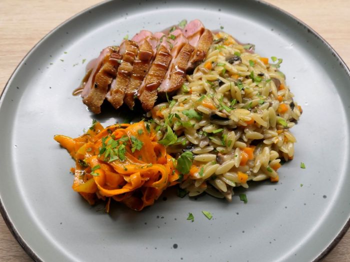 Für die Entenbrust Backofen auf 130° vorheizen. Die Entenbrustfilet von der Hautseite vorsichtig rautenförmig einritzen, nicht ins Fleisch schneiden. Nun salzen und pfeffern und in einer Pfanne, ohne Fett, von der Hautseite anbraten (nicht zu heiß). Tritt das Entenfett aus die Kräuterzweige zugeben und braten bis die Haut knusprig ist. Dann wenden für 2 - 4 Minuten weiterbraten und im Ofen für 20 Minuten auf dem Rost garen. Die Entenbrust aus dem Ofen nehmen und 2-3 Min. in Alufolie ruhen lassen. Entenbrust schräg nach Belieben aufschneiden.