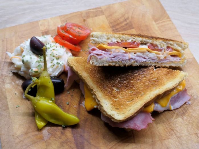 Für das Sandwich den Toast mit gewünschter Bräunung toasten. Nun jeden Toast sehr dünn Butter und darauf eine feine Schicht Frischkäse streichen. Jeweils 2 Toastscheiben erst mit Prosciutto einen kleinen Löffel Krautsalat und zwei Scheiben Cheddar bedecken. Darauf fein geschnittene Scheiben Tomaten legen. Als Deckel die andere Toastscheibe drauflegen. Das Sandwich für 3 Minuten bei 180 °C Umluft backen. Wer hat kann auch gerne einen Sandwich Maker nehmen.