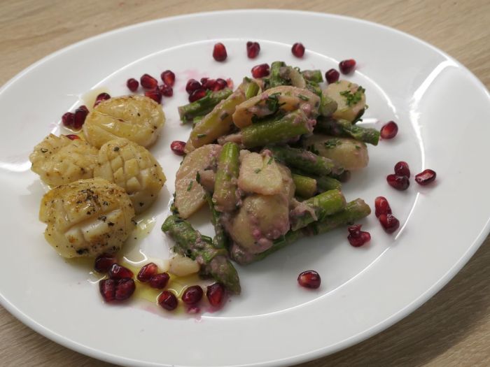 Kartoffeln und Spargel in eine Schüssel geben und mit den Granatapfel Dressing nach Geschmack vermischen.