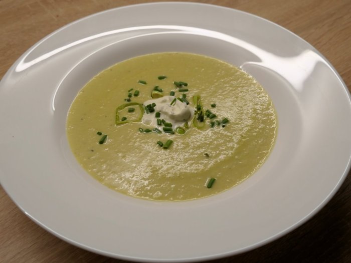 Die Suppe mit einem Pürierstab glatt pürieren und mit Salz und Pfeffer abschmecken. Erneut bei kleiner Hitze 5 Minuten ziehen lassen. Appetitlich auf Teller oder Schale anrichten und mit einem Esslöffel Crème fraîche Kräuter und dem frischen Schnittlauch, sowie dem gebratenen Lauch garnieren.