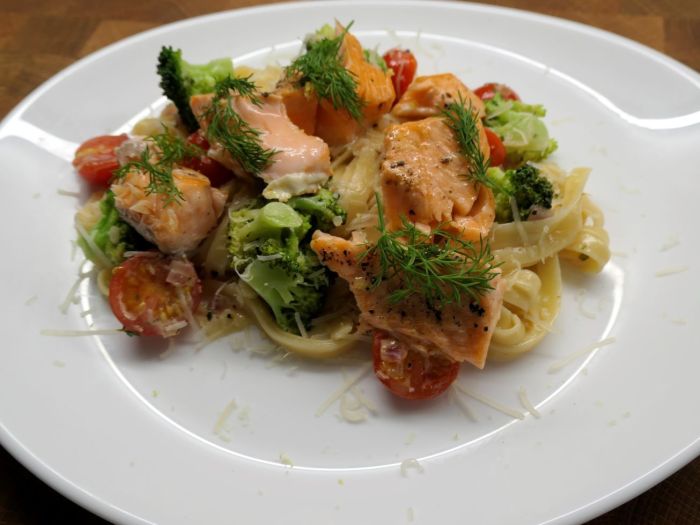 Die Pasta auf zwei vorgewärmte Teller geben. Den Lachs von der Haut nehmen und in Stücke trennen, sowie über der Pasta verteilen. Als Topping mit Parmesan, dem Rosa Pfeffer und Dill garnieren.
