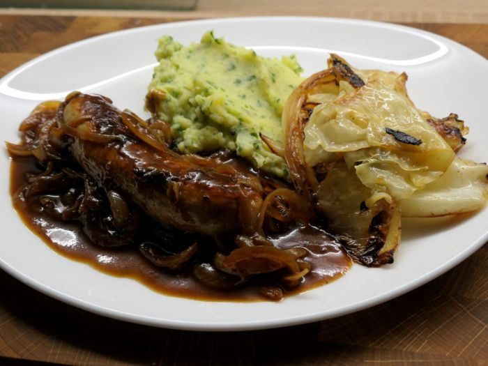 Kartoffelstampf auf die Teller geben, Spitzkohl dazu legen und die Bratwürste darauf platzieren. Die Malzbier-Zwiebel-Soße darüber geben und servieren.