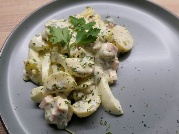 Die Kartoffeln als Pellkartoffel in ausreichend Salzwasser kochen und danach das Kochwasser abschütten und die Kartoffeln ausdünsten lassen. Die Eier kochen, sodass sie noch wachsweich im Eigelb sind, danach die Eier abpellen und in sechstel Schneiden. Fleischwurst in kleine Würfel und die Cornichons in feine Scheiben schneiden und beides in eine Schüssel geben. Joghurt, Mayonnaise, Sahne, Senf, Gurkenwasser zugeben und alles verrühren. Nun das Dressing mit Salz, Pfeffer, Zucker, Senf, Essig und Olivenöl abschmecken. Am Ende die Petersilie unterheben. Die gesamte Masse kann gut kräftig abgeschmeckt werden, die Kartoffeln ziehen ausreichen Geschmack aus dem Dressing. Zuletzt die noch warmen Kartoffeln abpellen und in Scheiben geschnitten zu dem Dressing geben. Ebenso die Eier Stücke. Alles gut unterheben und eine ausreichende Zeit, für mindesten 2 Stunden, durchziehen lassen.
