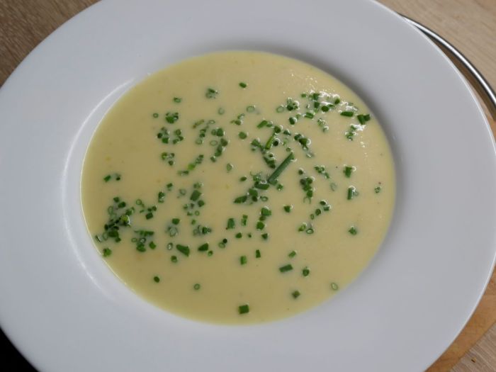 Nun mit Salz, weißem Pfeffer, dem Zucker und einigen Spritzer Zitronensaft sowie Essig abschmecken. Die Suppe noch eine wenig bei kleiner Hitze ziehen lassen, in Teller abfüllen und mit fein geschnittenem Schnittlauch garnieren. Guten Appetit.