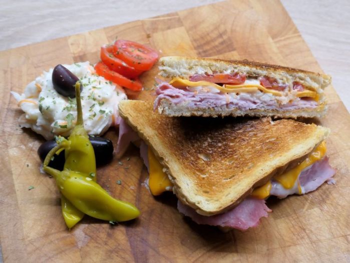 Für das Sandwich den Toast mit gewünschter Bräunung toasten. Nun jeden Toast sehr dünn Butter und darauf eine feine Schicht Frischkäse streichen. Jeweils 2 Toastscheiben erst mit Prosciutto einen kleinen Löffel Krautsalat und zwei Scheiben Cheddar bedecken. Darauf fein geschnittene Scheiben Tomaten legen. Als Deckel die andere Toastscheibe drauflegen. Das Sandwich für 3 Minuten bei 180 °C Umluft backen. Wer hat kann auch gerne einen Sandwich Maker nehmen.