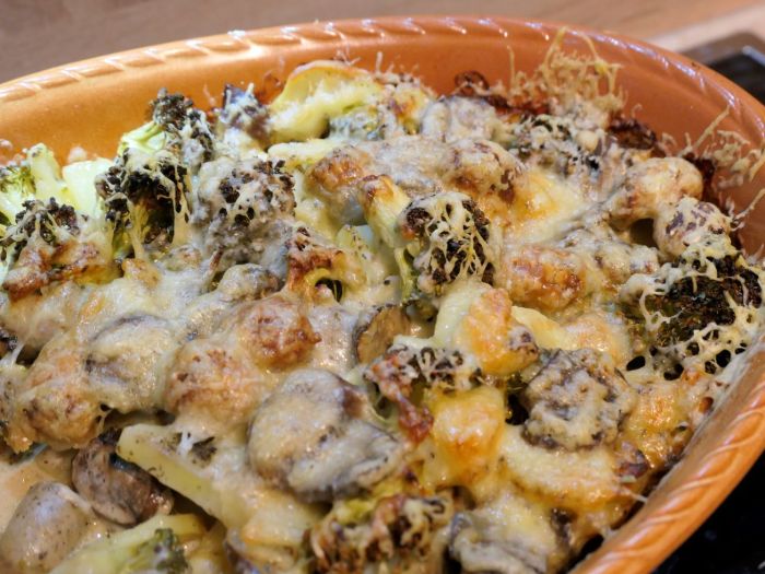 Kartoffeln schälen und in Scheiben schneiden und für 10 Minuten kochen. Die Kartoffeln sollten noch einen guten Biss haben. Den Broccoli in Röschen zerteilen und ca. 2 Minuten blanchieren danach unter kaltem Wasser kühlen und im Sieb abtropfen lassen. Die Bratwurst in ca. 2 cm Stücke schneiden und in einer Pfanne mit wenig ÖL scharf anbraten, dabei die gesäuberten und in Scheiben geschnittenen Champignons zugeben. Alle vorbereiteten Zutaten in einer ausreichend großen Auflaufform schichten und dann mit den Gewürzen, Wein, Rinderfond und Sahne bedecken.